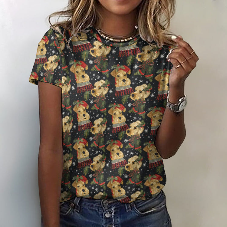 This charming tee features Airedale Terriers adorned in festive accessories, nestled among snowflakes and evergreen sprigs. The dogs' golden fur and joyful expressions capture the warmth and excitement of the holidays.