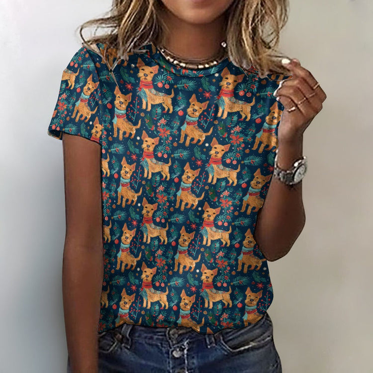 This delightful t-shirt exudes the warm spirit of Christmas with playful Airedale Terriers adorned in festive attire. Set against a rich navy blue background, the vibrant reds, greens, and winter whites pop, creating a joyful and festive canvas.