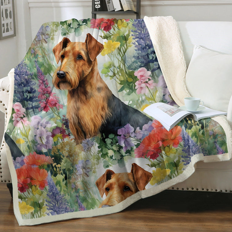 This exquisite blanket captures the essence of the Airedale Terrier, renowned for its intelligence and noble demeanor, set against a backdrop of vibrant lupines, poppies, and delicate lilacs. With the Airedale's attentive gaze adding a touch of living warmth, the blanket feels like a serene garden brought to life.