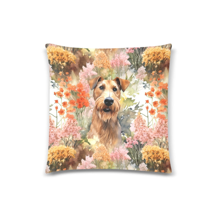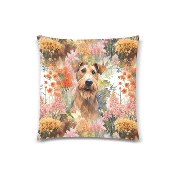This exquisite pillow cover features the Airedale Terrier, known as the 'King of Terriers', set against a canvas of autumnal beauty. The design highlights the Airedale's noble bearing and distinctive tan and black coat, which blends seamlessly with the backdrop of rich, warm florals. Capturing the Airedale's alert expression and perky ears, the pillow cover reflects the breed's intelligence and readiness, set amongst a blend of fiery orange and soft pink blooms that evoke the cozy essence of fall.