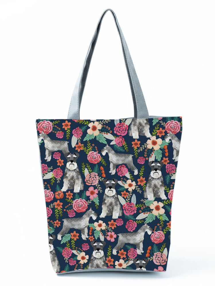 Made of polyester, with a top zipper closure, comfortable and durable handles, and featuring the cutest Schnauzer in bloom design.
