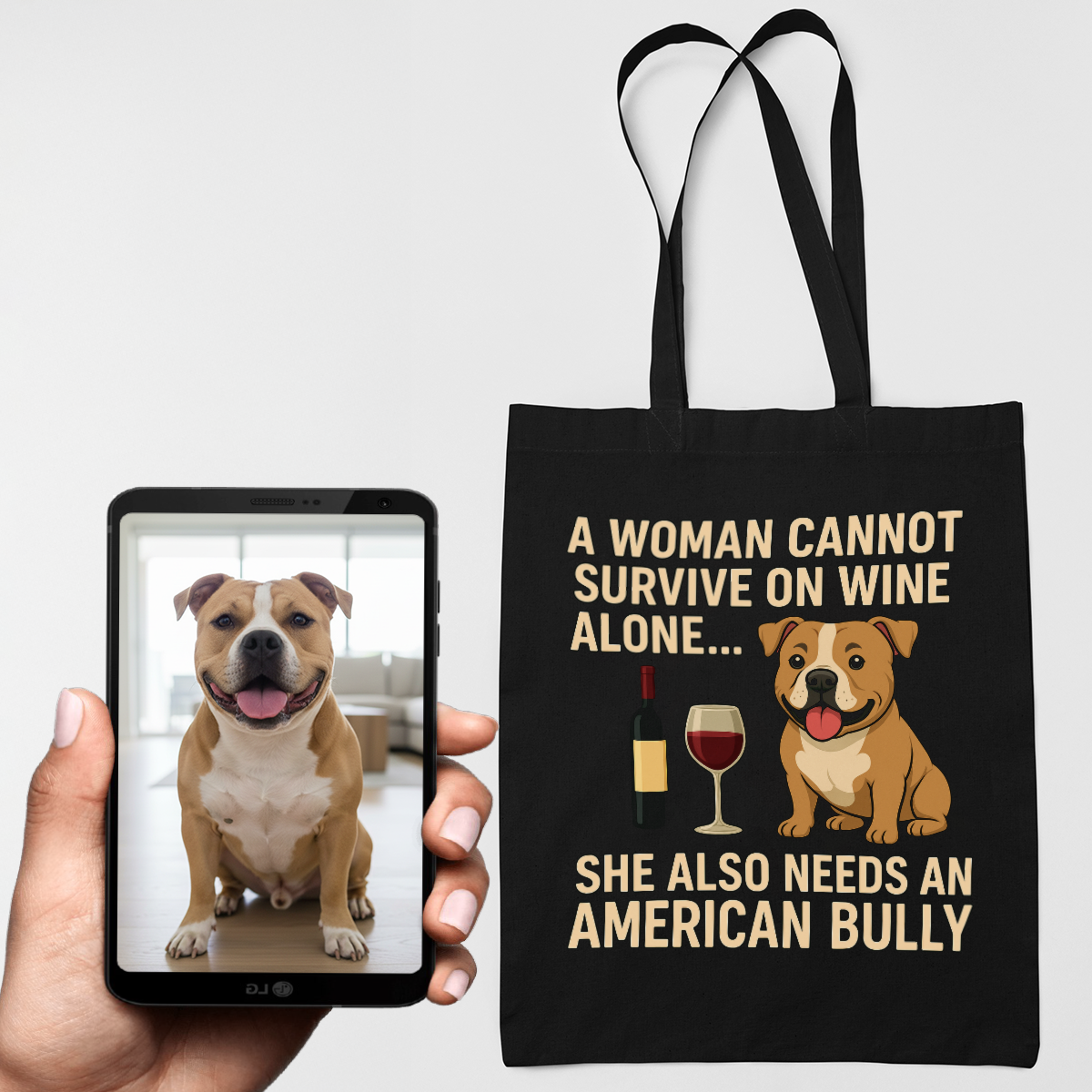Celebrate the unbreakable bond between you and your American Bully with our Personalized “A Woman Cannot Survive on Wine…” Custom American Bully Tote Bags! This heartfelt accessory is perfect for dog lovers who want to flaunt their furry friend’s unique personality.