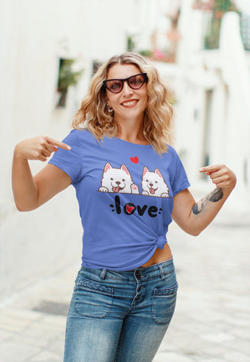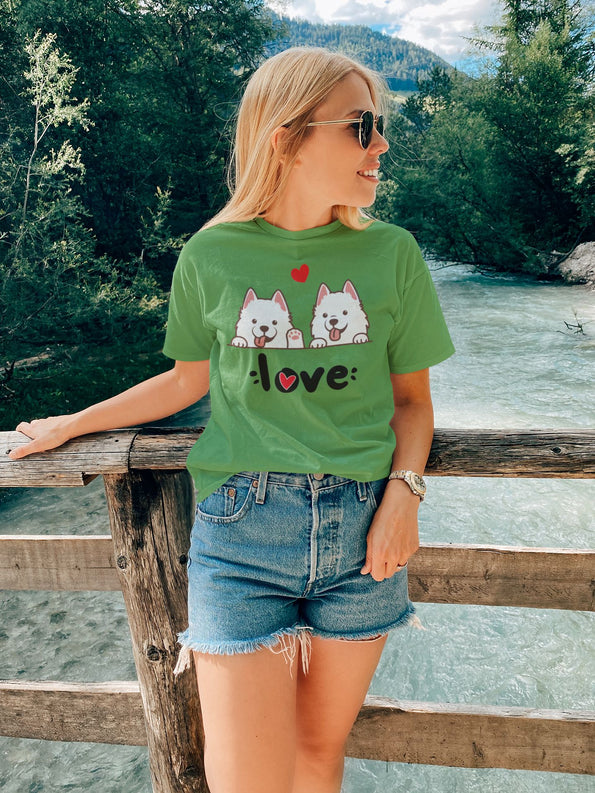 This adorable t-shirt features two super cute American Eskimo Dogs, with the word "love" written below them and a heart floating above. It's a design that will melt your heart and bring a smile to your face. Each time you wear this t-shirt, it will remind you of the special bond you share with your American Eskimo Dog, filling your day with happiness.