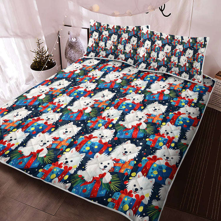 In a burst of holiday exuberance, this Festive Furry American Eskie Christmas Quilt Blanket Bedding Set presents an array of cheerful pups intertwined with vibrant colors of wrapped gifts and festive decorations. The fluffy white dogs embody joy, each donning a cheerful expression that reflects the happiness of the holiday season.