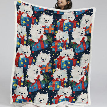 In a burst of holiday exuberance, this blanket features cheerful American Eskimo dogs intertwined with vibrant gifts and festive decorations. The fluffy white dogs, donning bright red ribbons, embody the joy of the season.