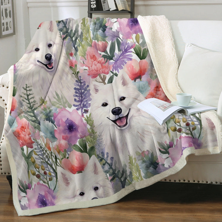 Watercolor Garden American Eskimo Dogs Soft Warm Fleece Blanket