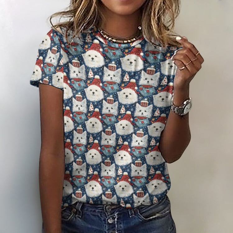 This delightful tee captures the essence of a snowy Christmas morning. The American Eskimo dog, adorned with festive decorations, takes center stage against a serene blue backdrop.