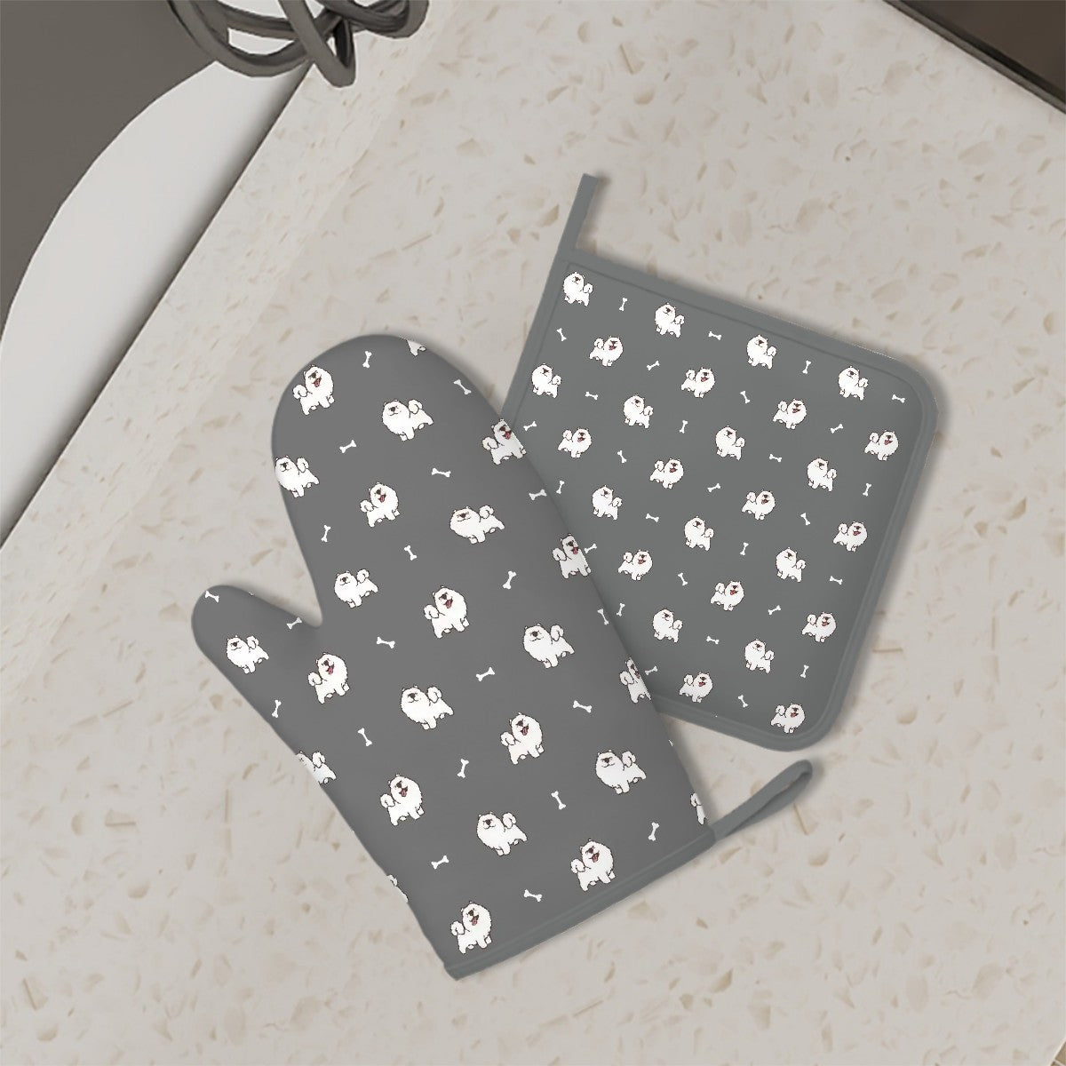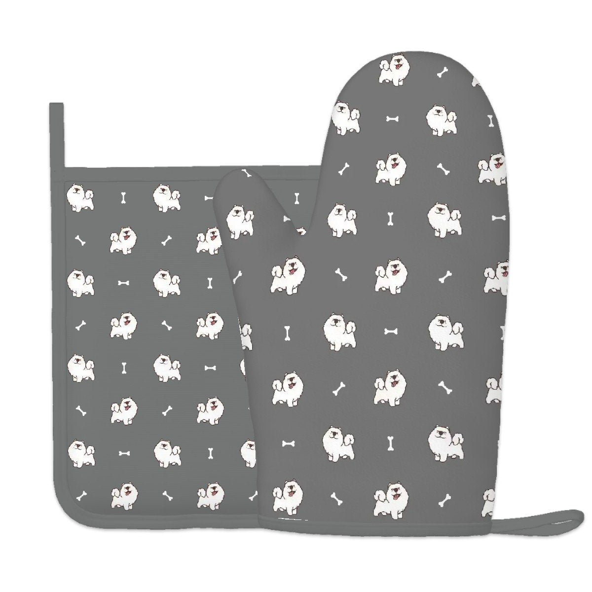 Smiling American Eskimo Dog Love Oven Mitts and Pot Holder Set