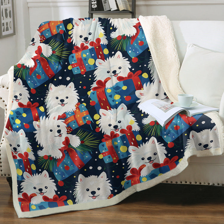 In a burst of holiday exuberance, this blanket features cheerful American Eskimo dogs intertwined with vibrant gifts and festive decorations. The fluffy white dogs, donning bright red ribbons, embody the joy of the season.