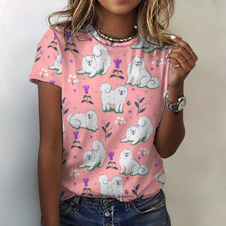 Show off your love for American Eskimo Dogs and nature with the Flower Garden American Eskimo Dog All Over Print Women's Cotton T-Shirt!