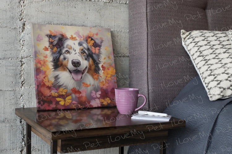 This exquisite piece of art beautifully merges the vivacious personality of the Australian Shepherd with the magical essence of fall. Set against a backdrop of rich, warm autumn leaves, the Australian Shepherd's sparkling eyes are full of life and intelligence drawing the viewer into a moment of pure connection.