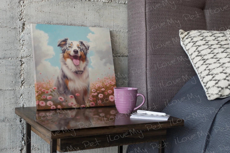 It's tail-waggingly good Australian Shepherd Decor for Australian Shepherd lovers, offering a glimpse into the joyous and tranquil moments these dogs bring into our lives. The attention to detail in every strand of fur and petal, coupled with the dreamlike quality of light and shadow, creates a sense of depth and expansiveness, inviting the viewer into an Australian Shepherd's world.
