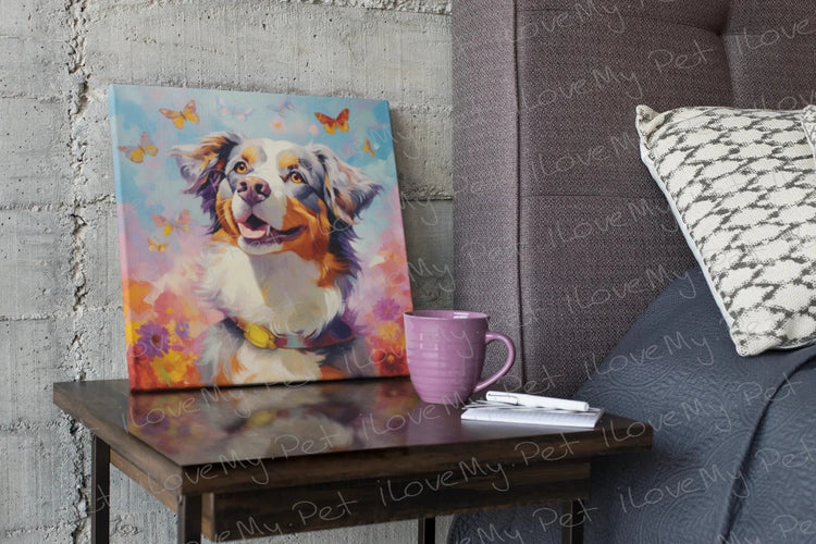 The Australian Shepherd Artwork is bathed in a warm, soft light, capturing the gentle essence of spring. Butterflies flutter around the Aussie, symbolizing transformation, while the background flowers in orange and pink create a color mosaic that complements the dog's vivacious spirit. This piece is a tribute to Australian Shepherd lovers, acknowledging the breed's boundless energy and affectionate nature.