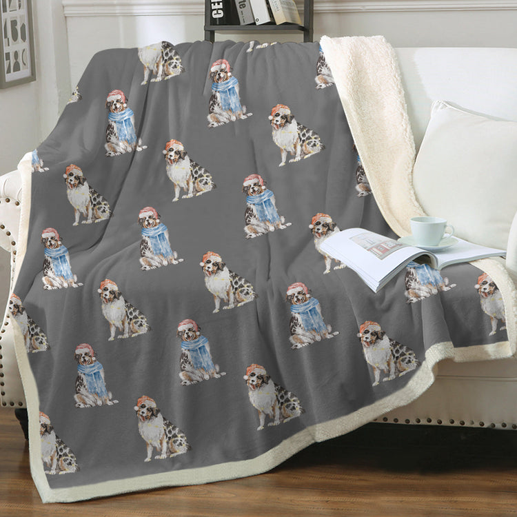 Wrapped in festive charm, this blanket features delightful watercolor illustrations of Australian Shepherds wearing red Christmas hats and cozy scarves. The artistic depiction captures their playful spirit, adding warmth and joy to your holiday decor.