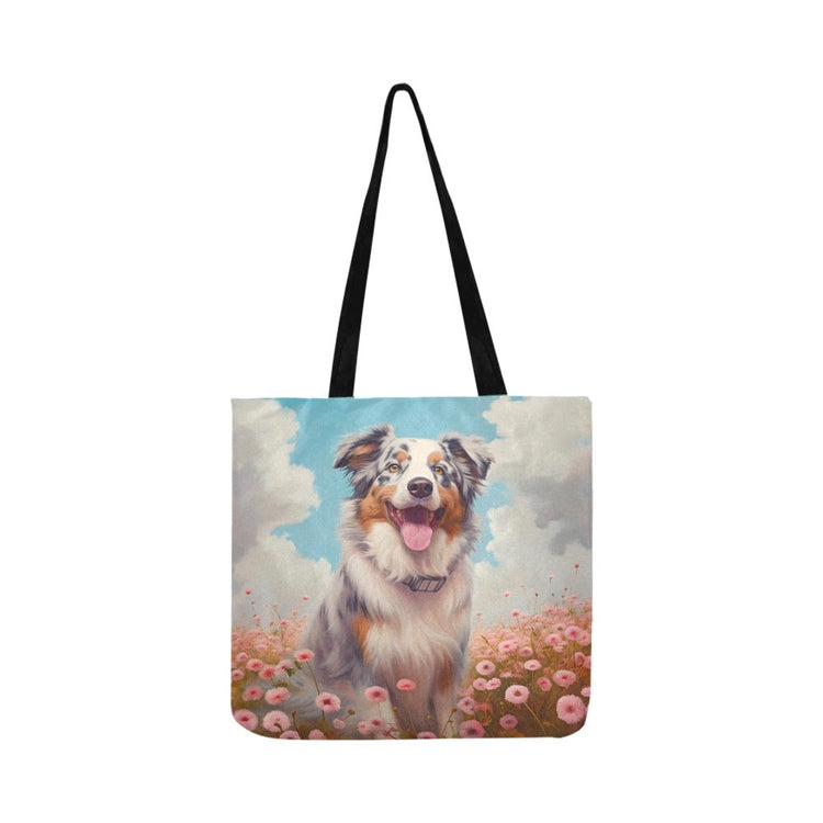 The artwork captures the vibrant character of the Australian Shepherd breed, with a multicolored coat and lively eyes mirroring the playful and gentle nature of the surrounding flowers. This seamless fusion of nature's beauty with the spirited essence of Australian Shepherds makes this tote bag not just an Australian Shepherd Accessory, but a piece of art.