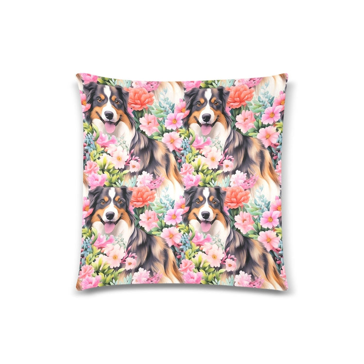The design features the Australian Shepherd's glossy, multi-colored coat and bright, inviting eyes, capturing the breed's renowned playfulness and intelligence. Surrounded by coral, pink, and soft green foliage, this pillow cover is a visual tribute to the lively spirit of the Australian Shepherd and the vibrant beauty of nature.