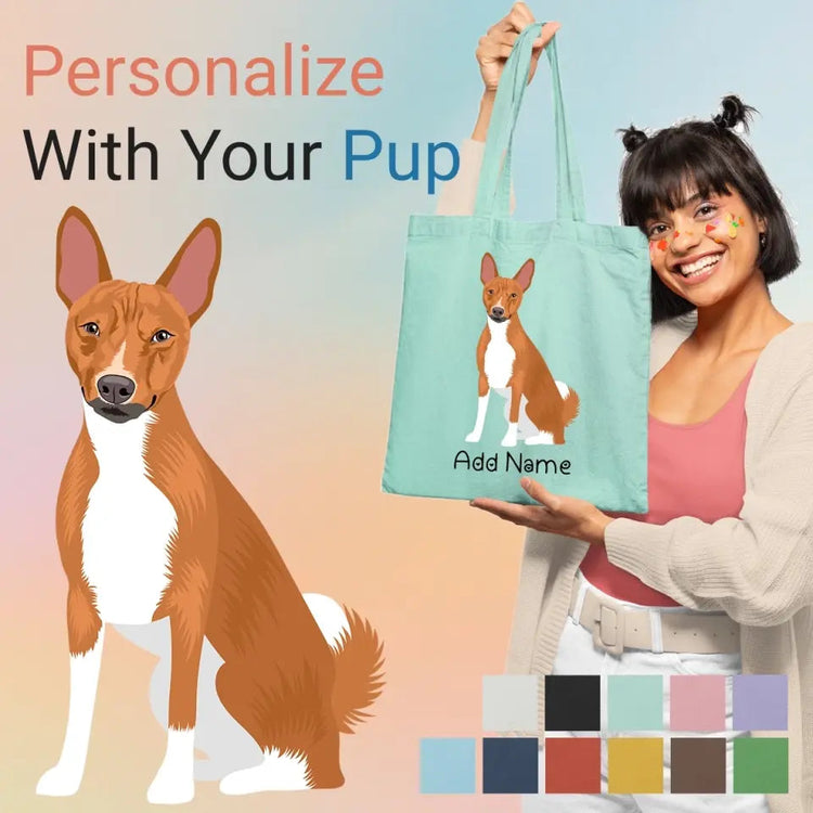 Personalize with your pup's name! Featuring the most adorable Basenji dog artwork, this canvas tote bag is a must-have for Basenji lovers. From the Heart: Thoughtful Gifts for Basenji Lovers. Its versatile design is perfect for carrying daily work essentials, lunch boxes, or workout gear. The bag is available in 11 vibrant colors with a safety zip closure, ensuring your belongings are secure.