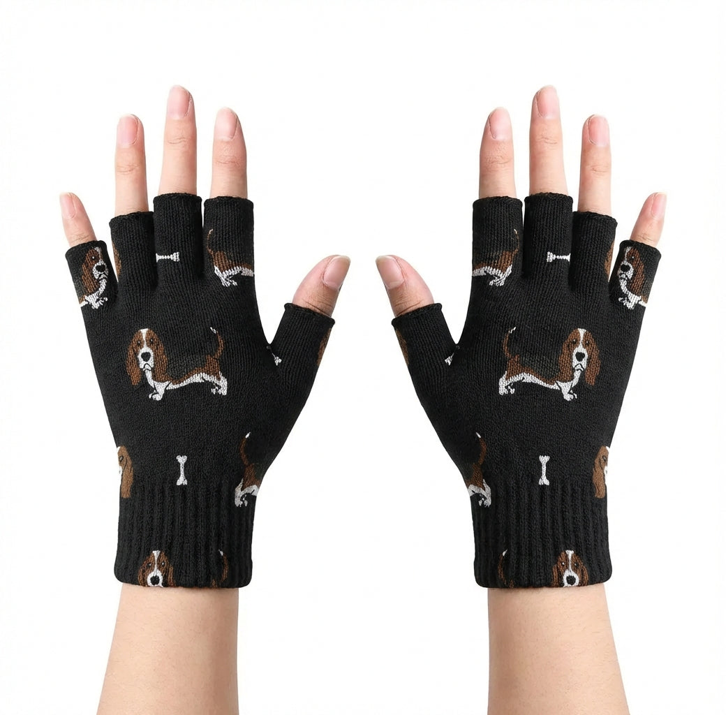 Available in elegant Ivory Cream and striking Midnight Black, these gloves complement any outfit. The repeating pattern emphasizes the Basset Hound's lovable and laid-back personality, making them a charming addition to your wardrobe. Explore our Basset Hound Gloves Collection.