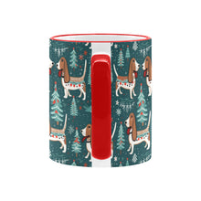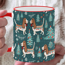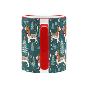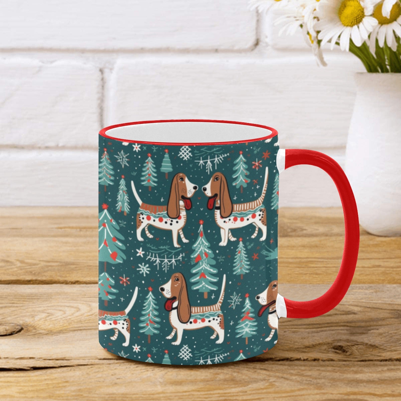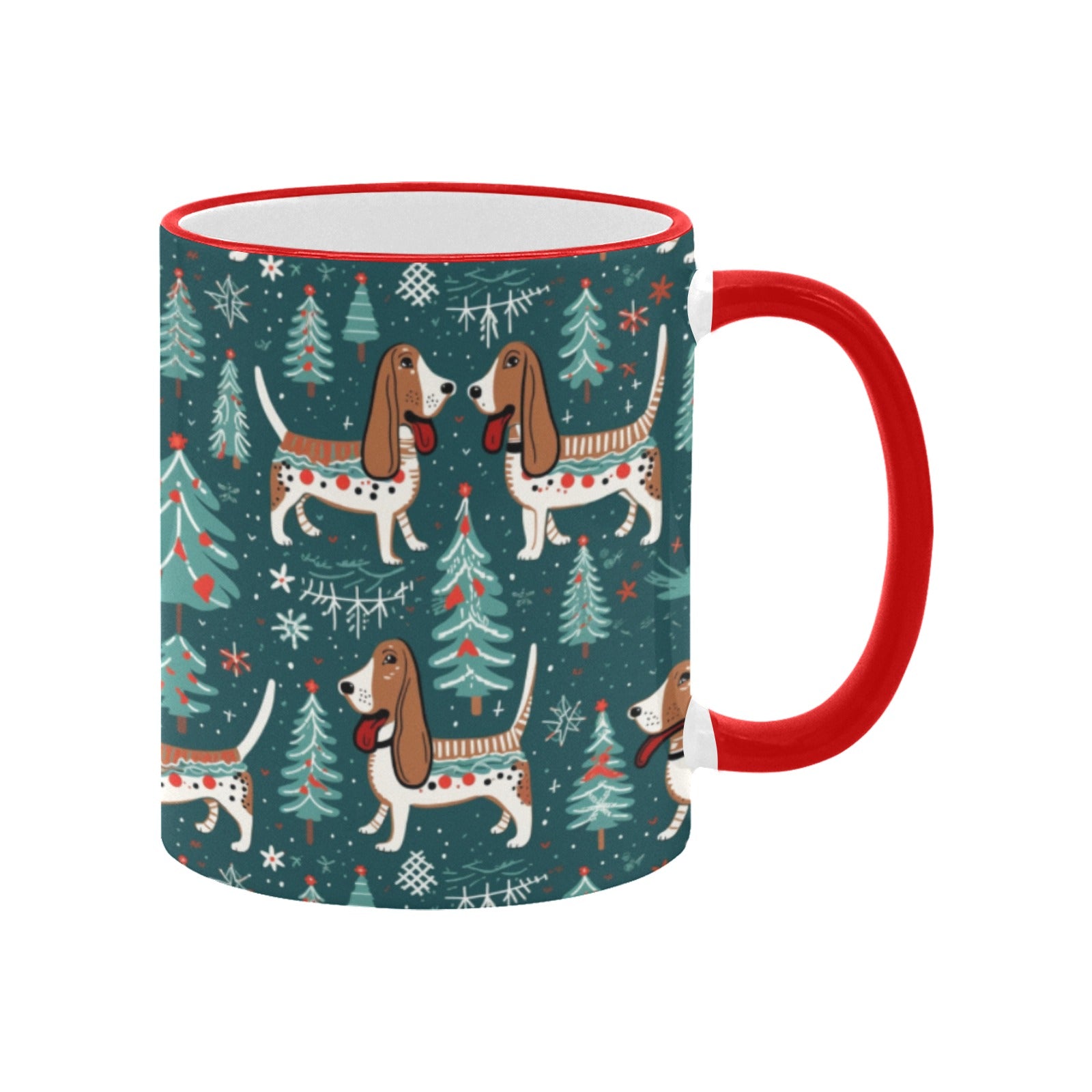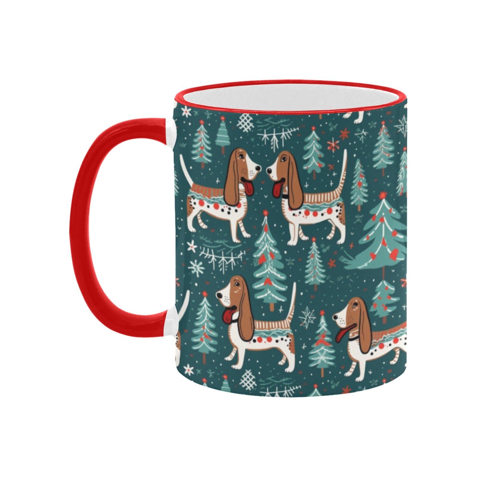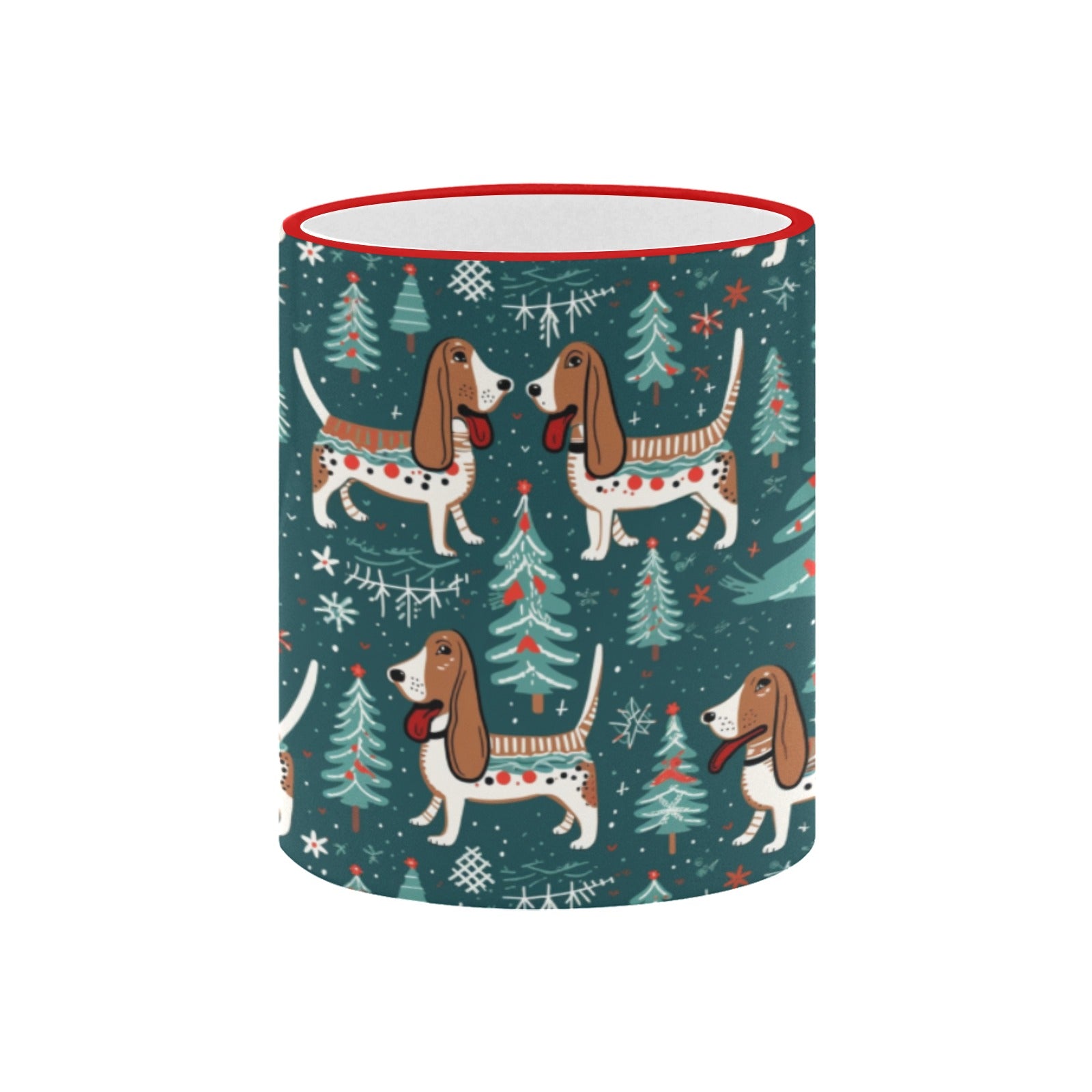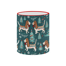 This whimsical mug features a delightful parade of Basset Hounds, each showcasing their unique personalities against a backdrop of festive decorations and wintry pines.