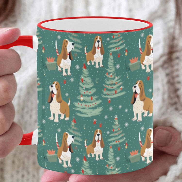 This charming mug features delightful Basset Hounds adorned in festive attire, bringing warmth and whimsy to your daily routine.