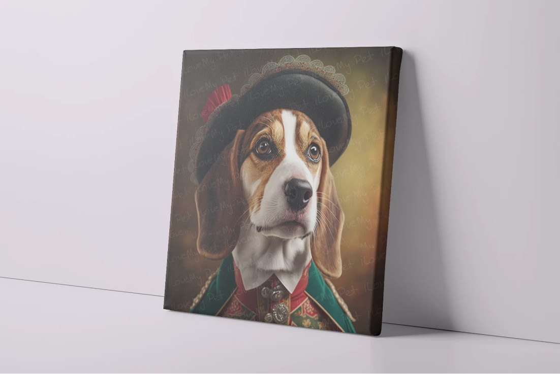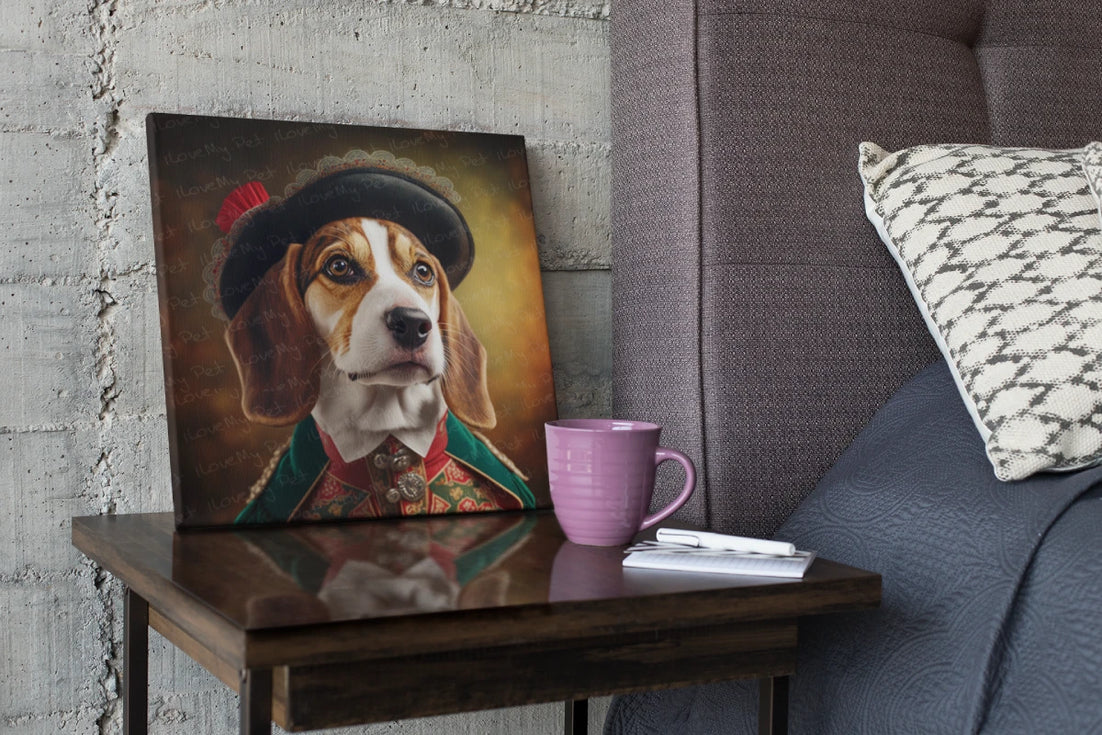 This exquisite piece of art features a whimsical portrayal of a noble Beagle, dressed in the grandeur of traditional English attire.