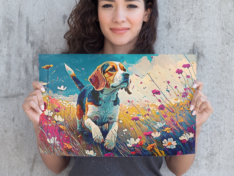 The true allure of this artwork lies in the interplay of realism and fantasy. The Beagle is surrounded by a whirl of color and motion, with petals that seem to dance around it, evoking a dynamic scene brimming with life.