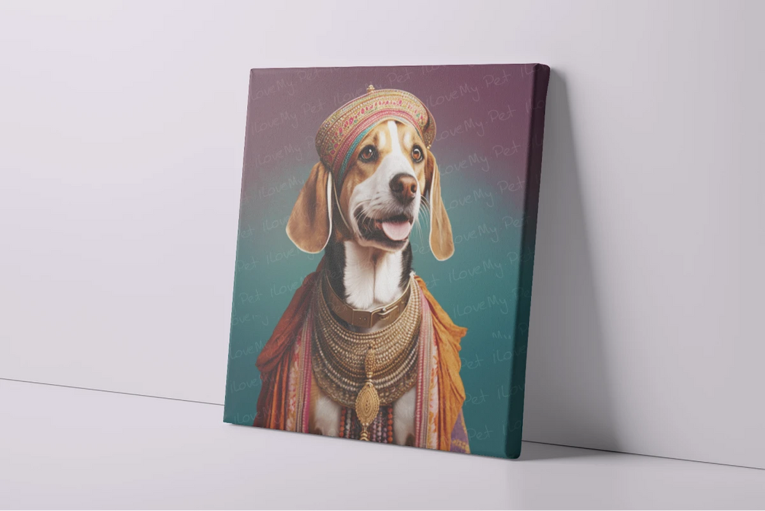 The poster portrays the Beagle in a richly embellished costume, complete with a majestic headdress and a broad, golden collar. The attire, inspired by the opulent courts of India or the Middle East, pays a playful yet respectful tribute to the regal splendor of bygone eras, making it an ideal piece of art for those who appreciate the finer things in life.