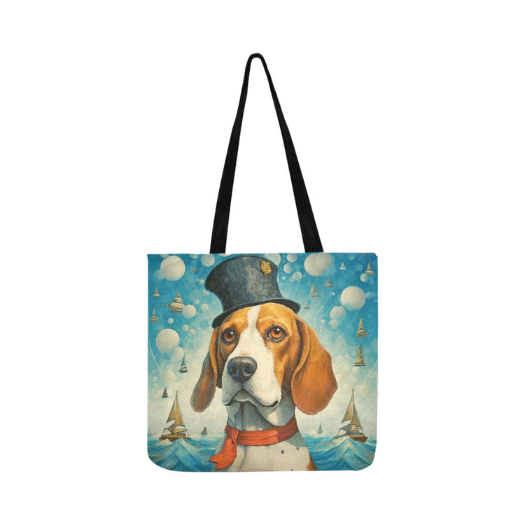 Featuring "Seafaring Splendor", this tote bag presents a Beagle adorned in a Victorian-era top hat, set against a dreamy seascape of ships sailing on a sea of bubbles.