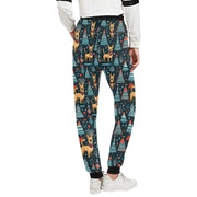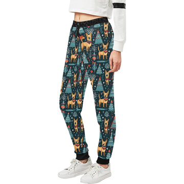 These sweatpants feature a vibrant tapestry of Belgian Malinois dogs, whimsically adorned with reindeer antlers, frolicking among wintry pines and festive firs. The playful pups, clad in cozy scarves, exude the merry spirit of the holidays, making them a perfect gift for dog lovers.