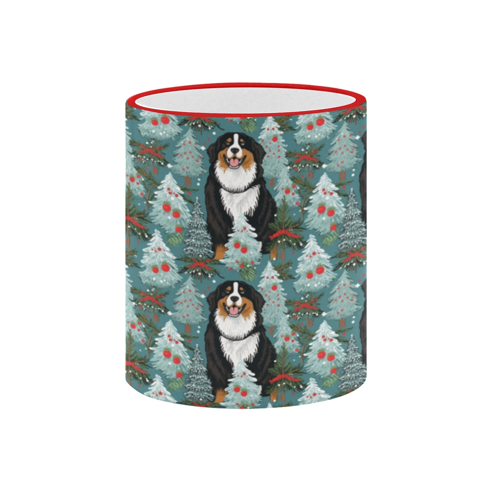 This delightful mug captures the heartwarming spirit of the holidays, featuring a charming Bernese Mountain Dog surrounded by a wintry forest of snow-frosted Christmas trees.