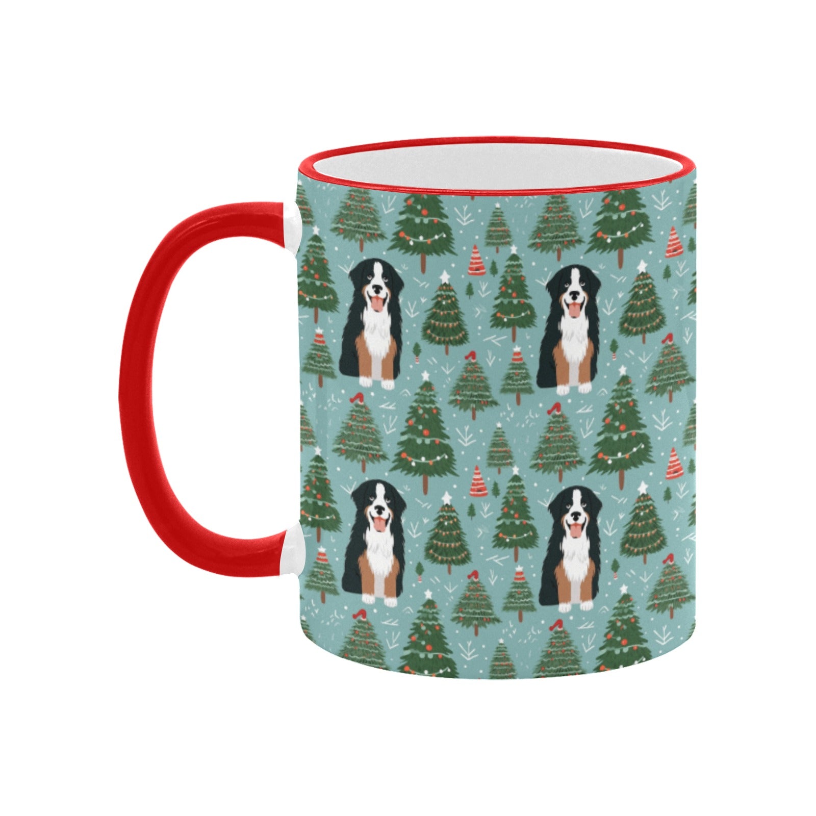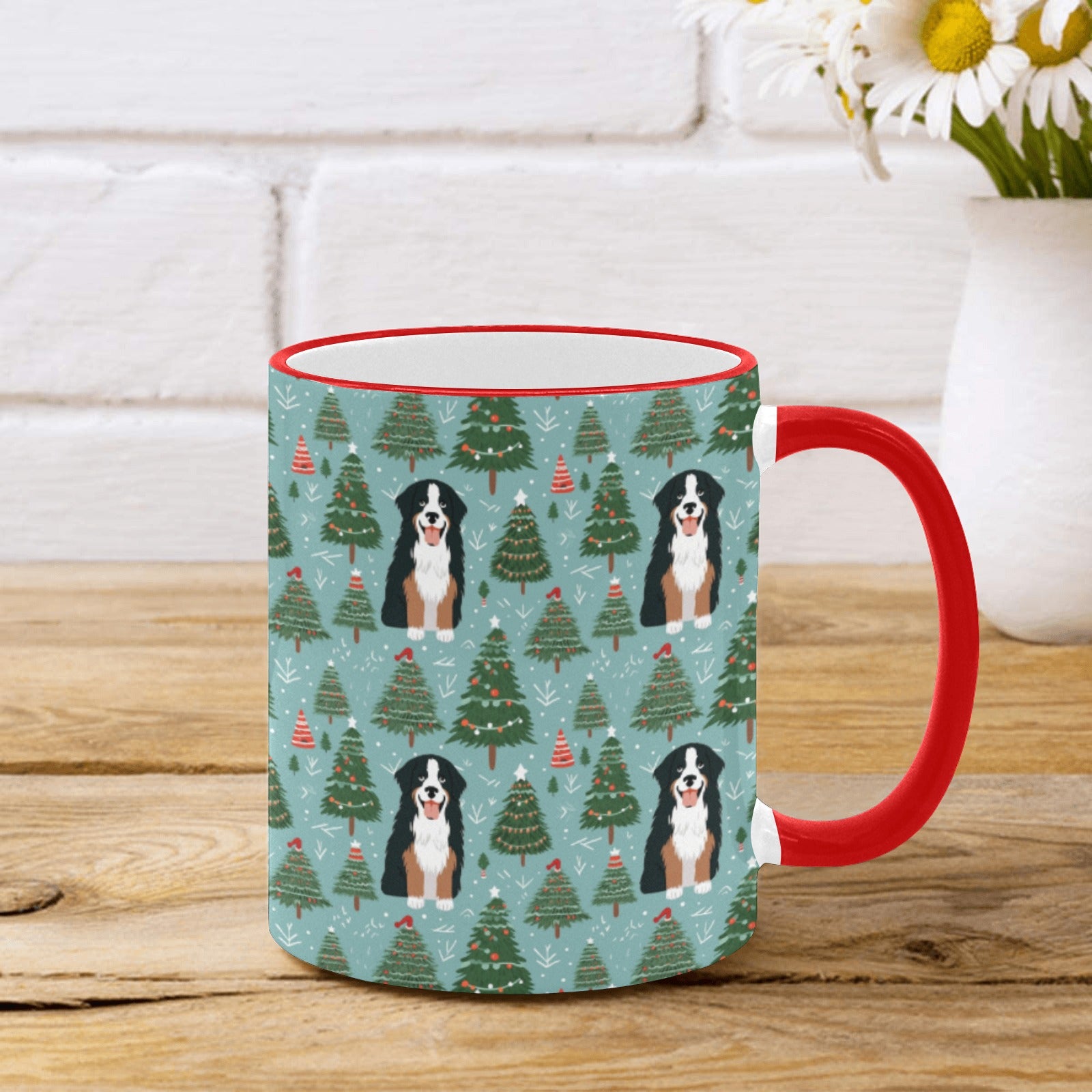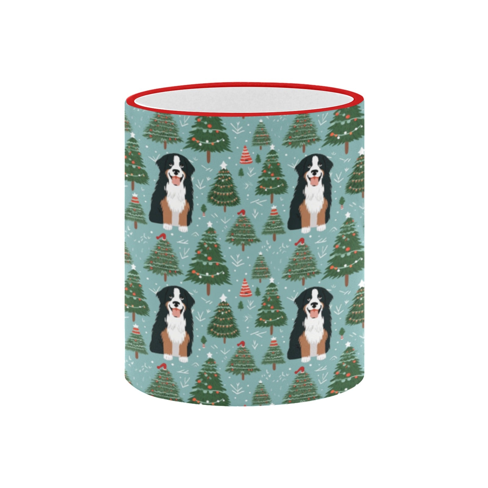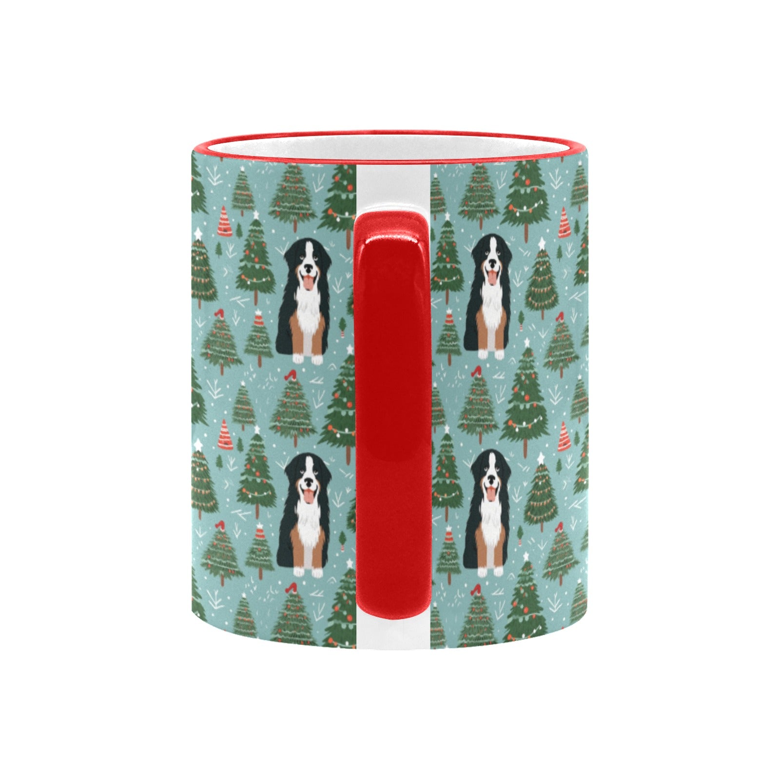 This delightful mug features a joyful Bernese Mountain Dog surrounded by a wintry forest, capturing the essence of festive cheer.