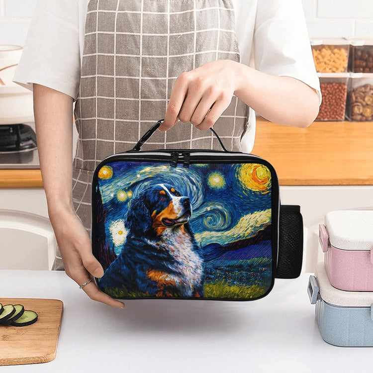 Introducing the Milky Way Bernese Mountain Dog Lunch Bag, where the majesty of the Bernese Mountain Dog meets the timeless beauty of Vincent van Gogh's "The Starry Night."
