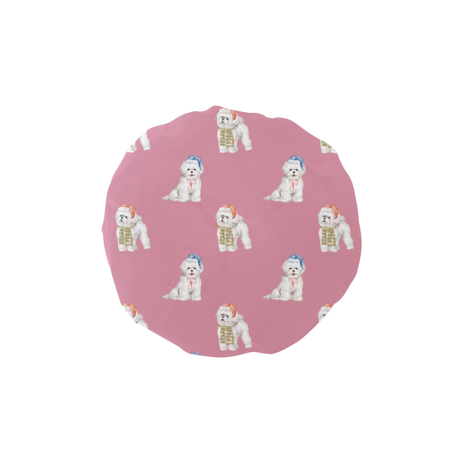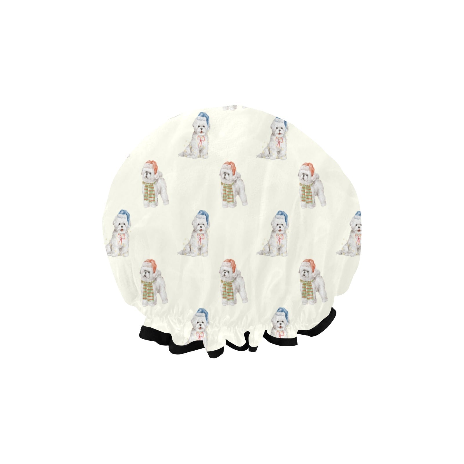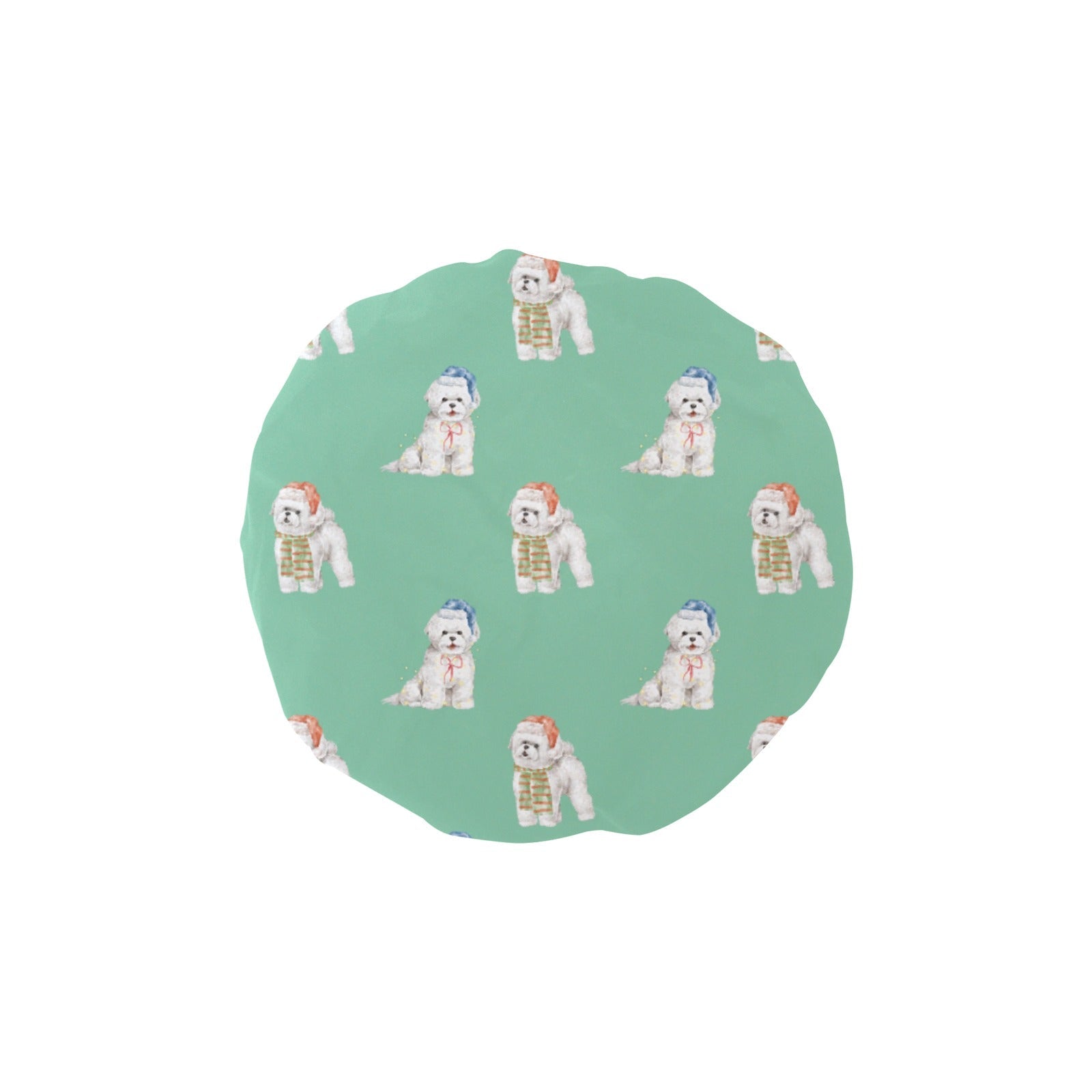 Featuring a stunning watercolor Christmas pattern of Bichon Frises, each shower cap showcases these adorable dogs adorned with red and blue Christmas hats, scarves, and festive accessories.