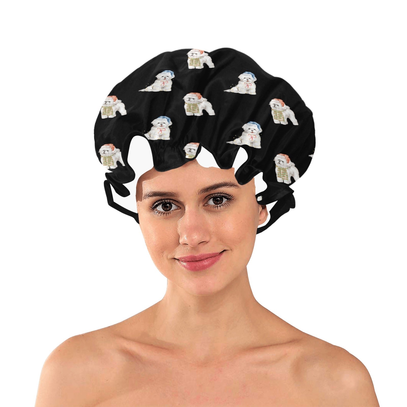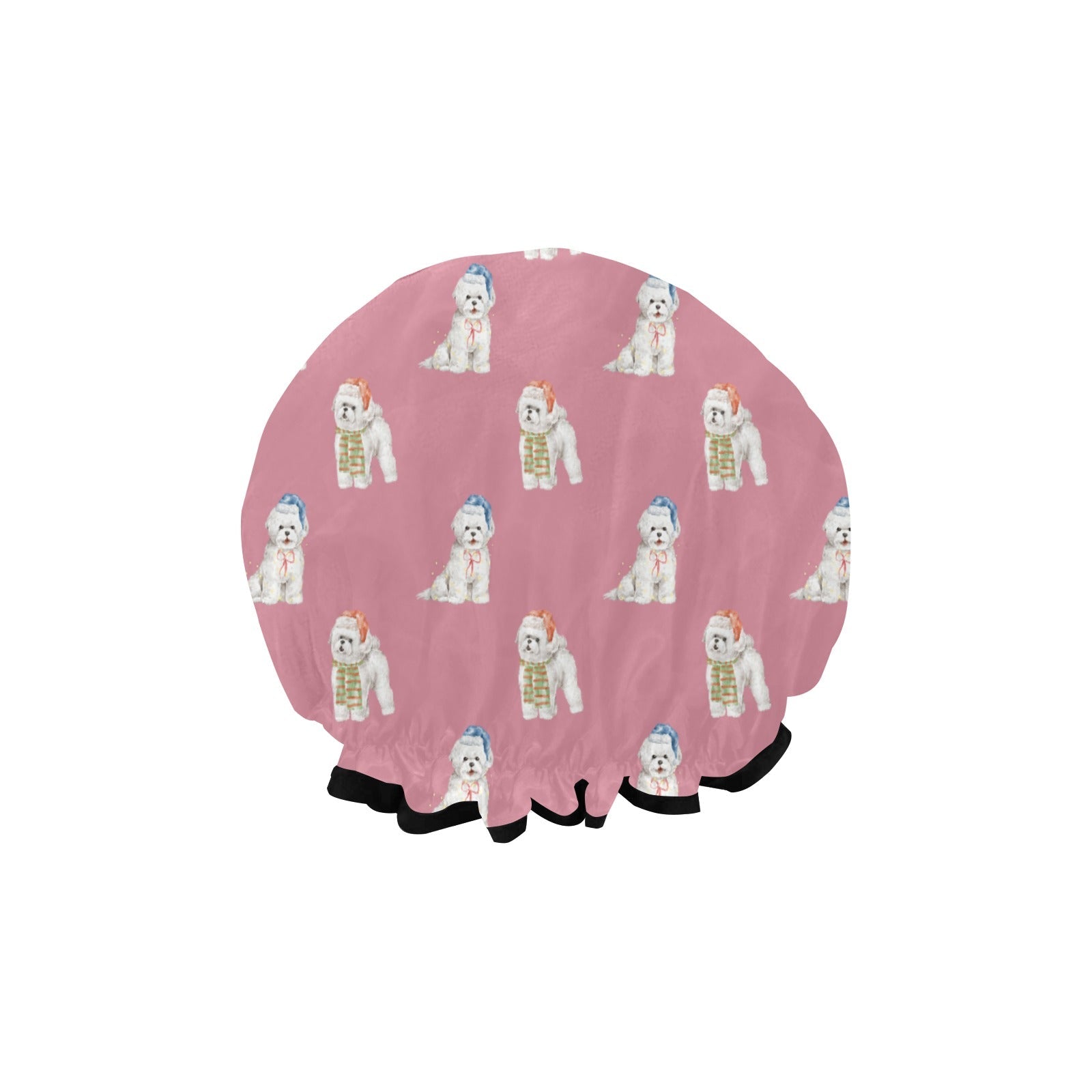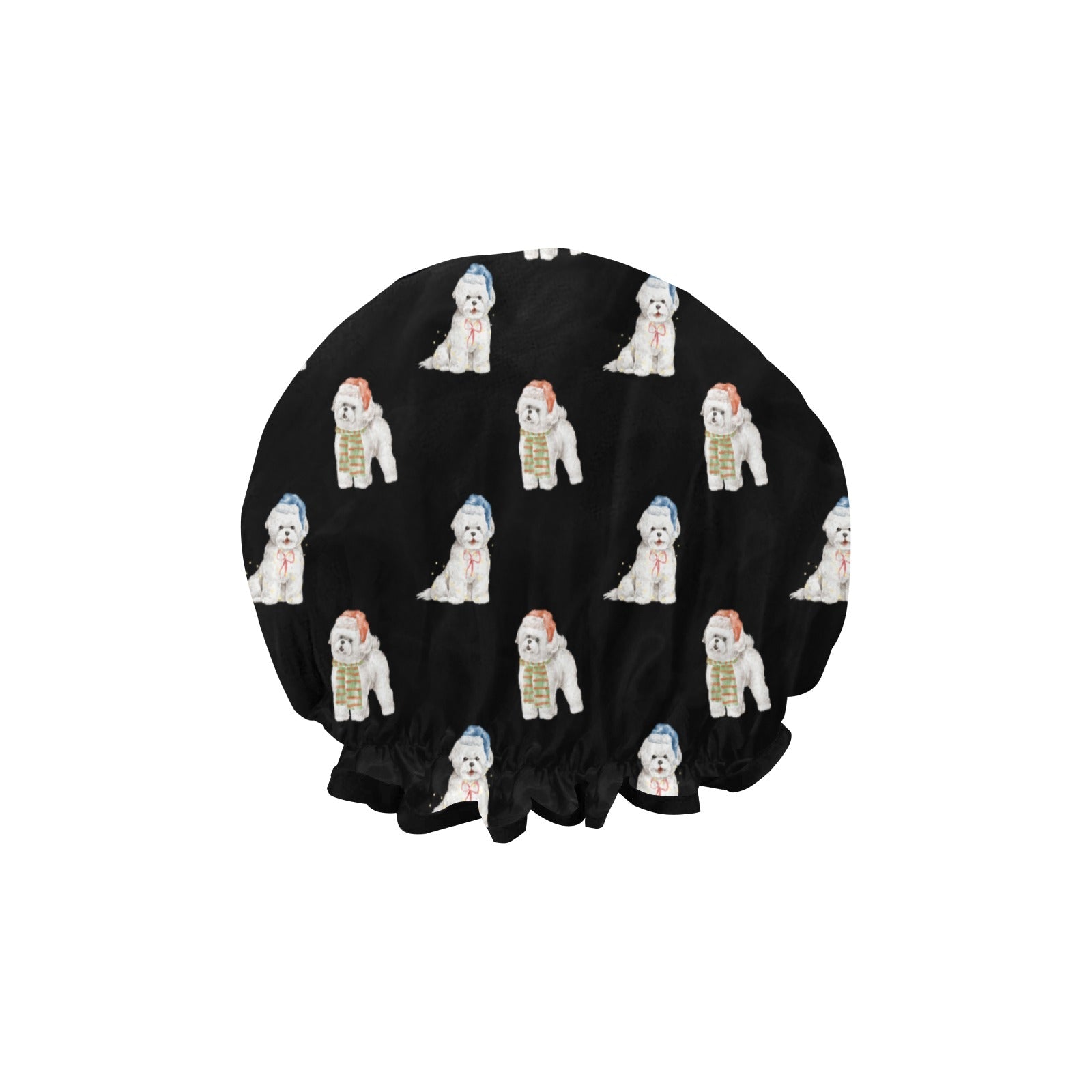 Featuring a stunning watercolor Christmas pattern of Bichon Frises, each shower cap showcases these adorable dogs adorned with red and blue Christmas hats, scarves, and festive accessories.