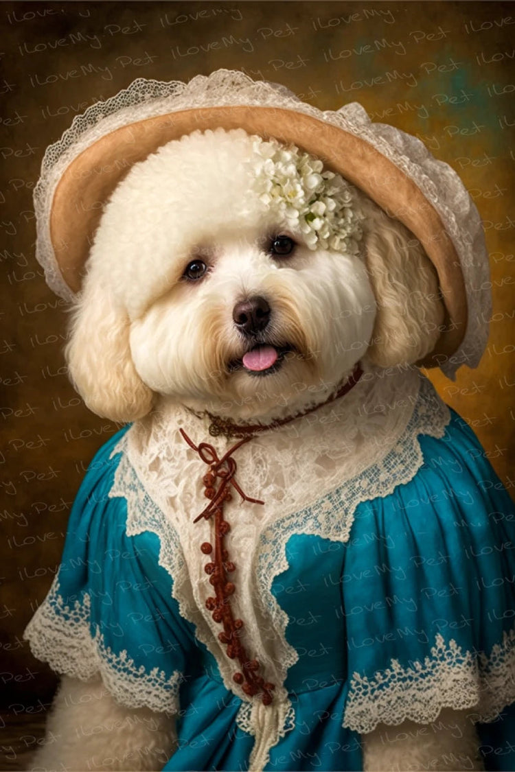 Bichon Frise Art is not just a visual delight but a playful interpretation of how these charming dogs might have been dressed in the royal courts of France and Spain.