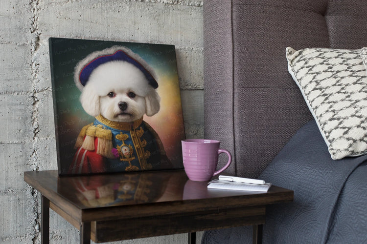 Adorned in a resplendent military uniform, this Bichon Frise is not just a pet but a regal figure, showcasing the breed's aristocratic past. The rich tapestry of royal blue and intricate gold braiding, along with the prestigious medals and emblems, celebrate the valor and distinction of this noble breed.