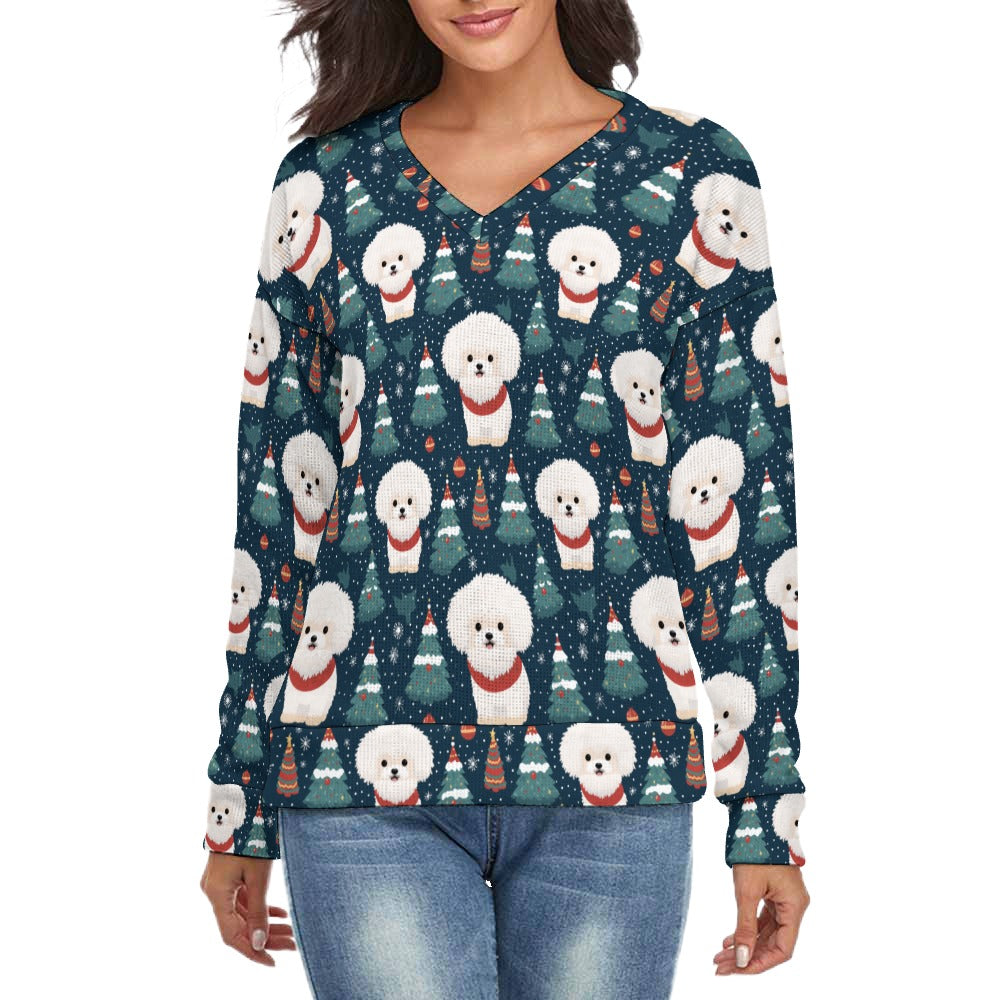 Embrace the magic of the season with our Snowflakes and Snuggles Bichon Frise Women's V-Neck Christmas Sweater.