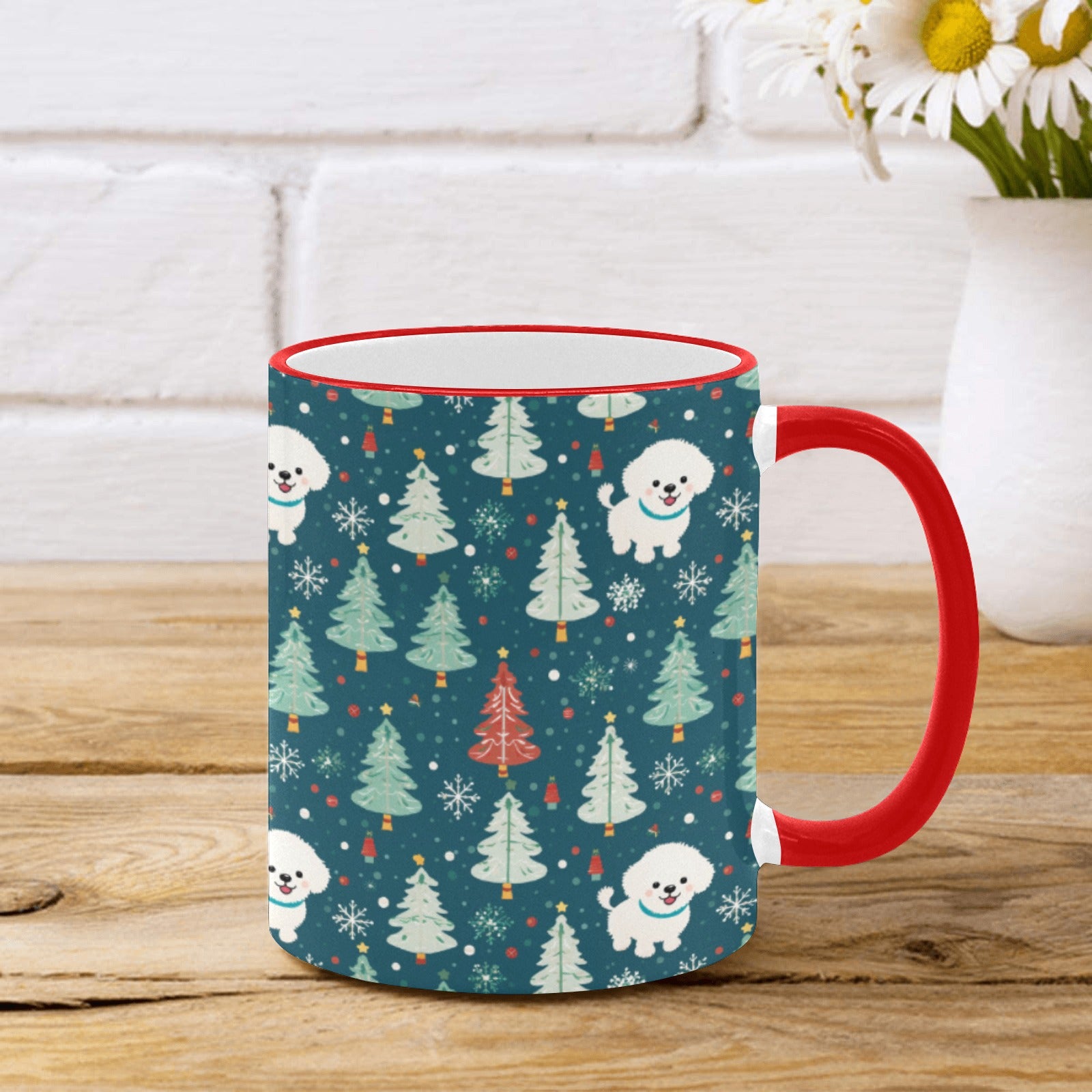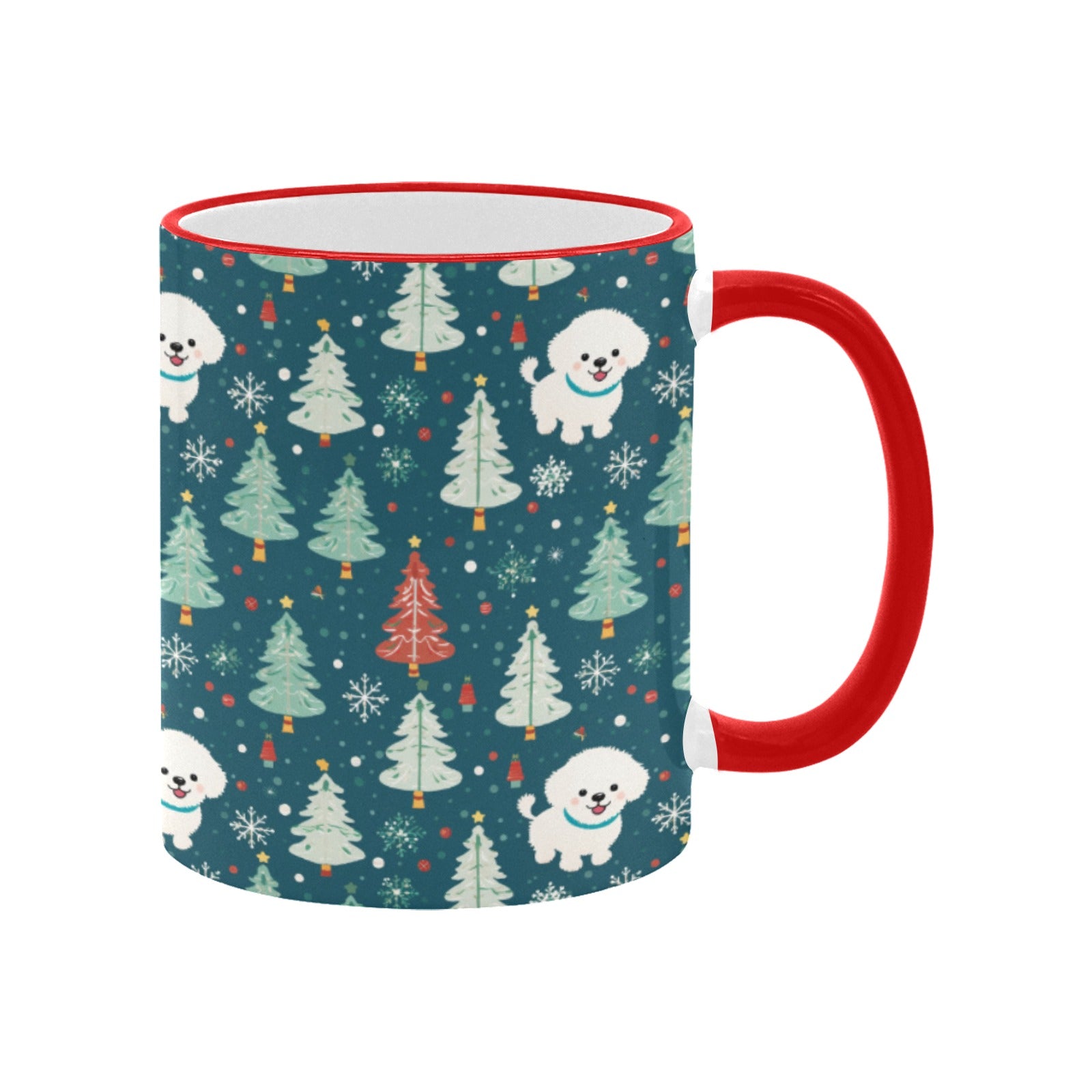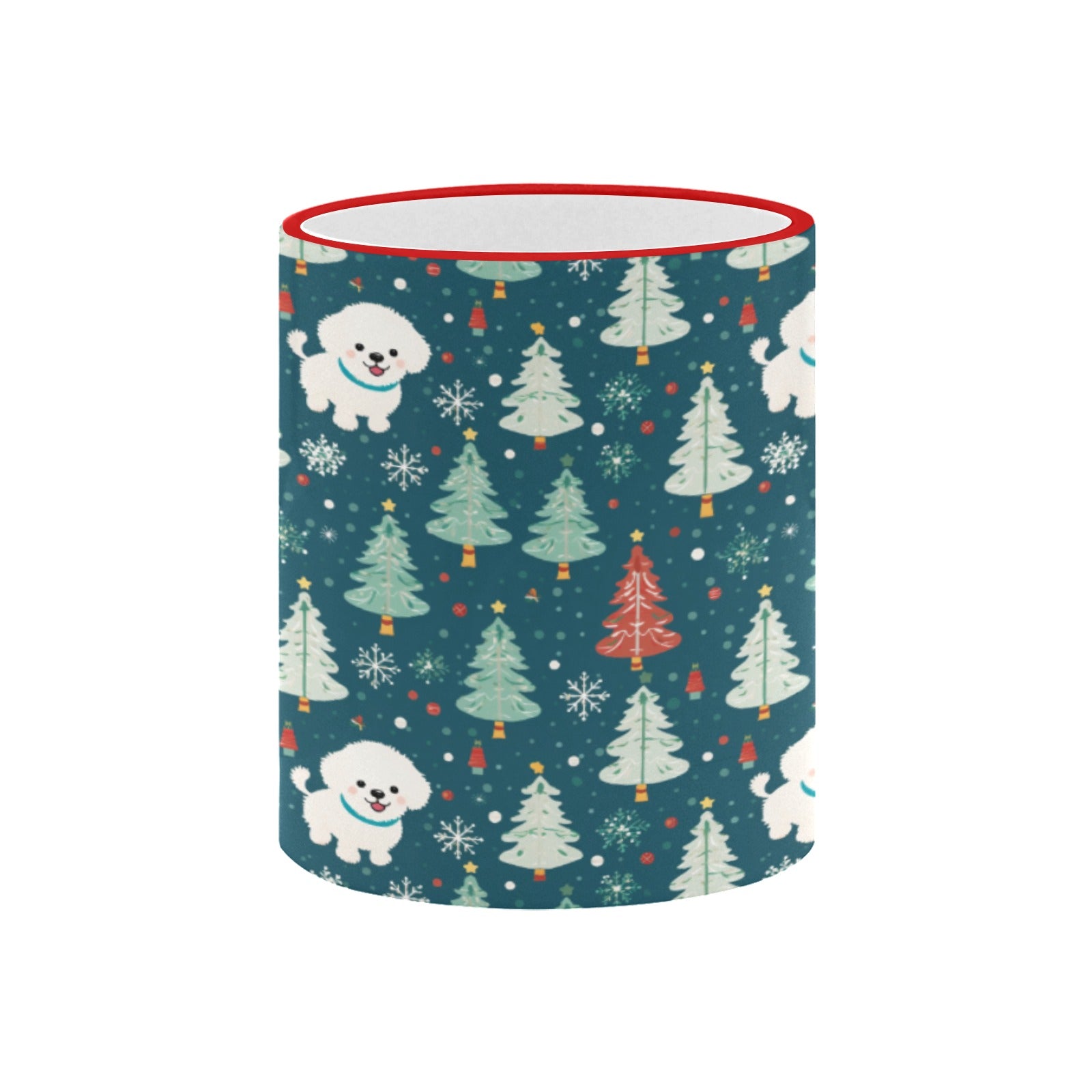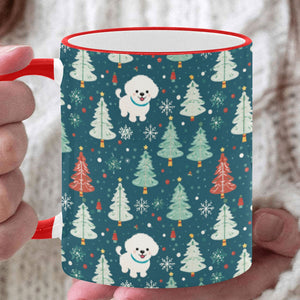 This delightful mug features an adorable Bichon Frise, surrounded by whimsical Christmas trees, bringing warmth and cheer to every sip.