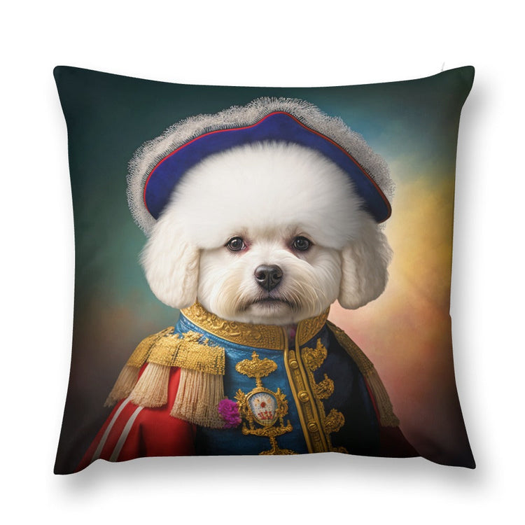 This plush pillow case features a whimsical portrayal of the noble Bichon Frise, a breed celebrated for its merry disposition and luxuriant fur, adorned in a traditional Napoleonic era uniform.