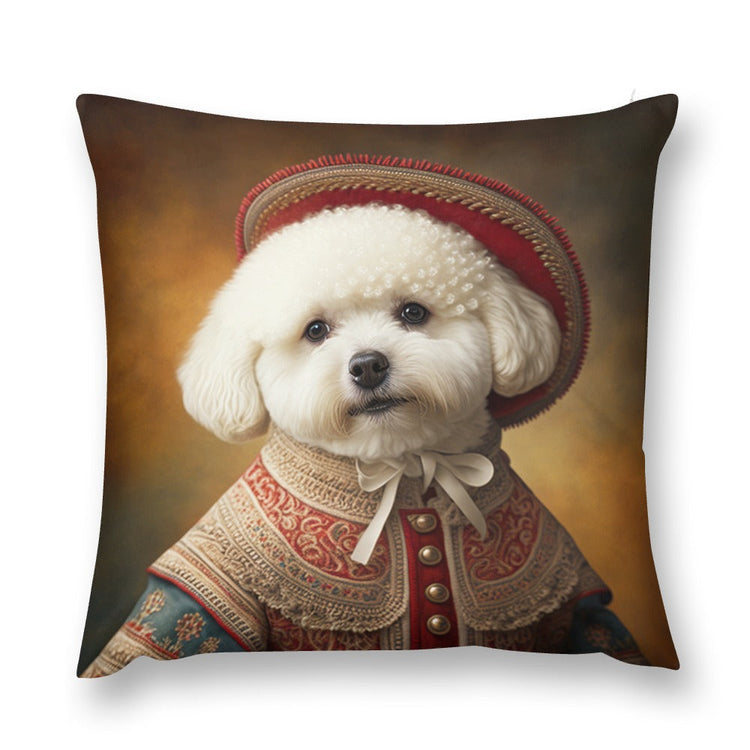 This exquisite pillow case captures the essence of the Bichon Frise, a breed known for its friendly nature and fluffy, cotton-like coat, adorned in the lavish attire of the Renaissance period.