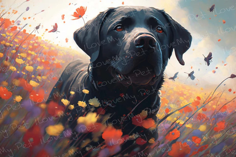 Embrace the elegance and warmth of our Vibrant Meadow Black Labrador Wall Art Poster, a must-have for any Black Labrador enthusiast.