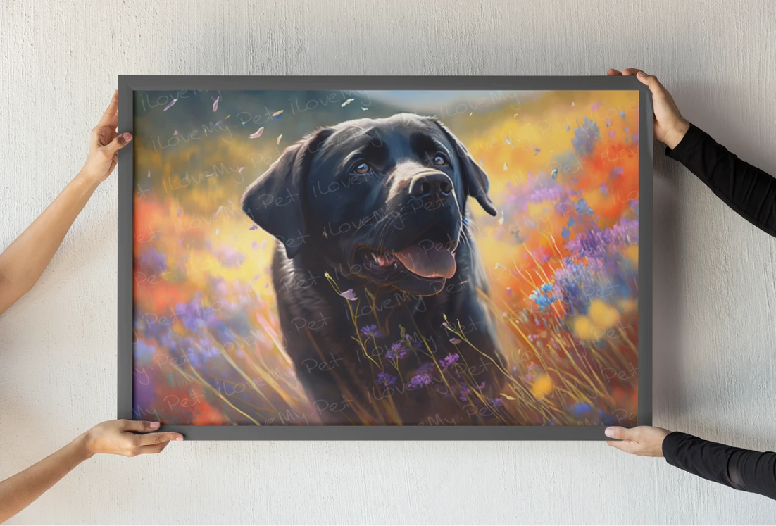 This stunning piece showcases a majestic Black Labrador Retriever set against a backdrop of vibrant flowers, including poppies and wildflowers. The Labrador's glossy black coat is rendered with incredible attention to detail, highlighting the breed's friendly demeanor and loyal companionship.