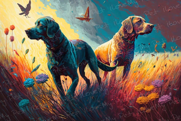 This stunning piece of art portrays a pair of Labradors – one cloaked in the mystery of night, the other basking in the light of dawn – standing amidst a meadow adorned with wildflowers.