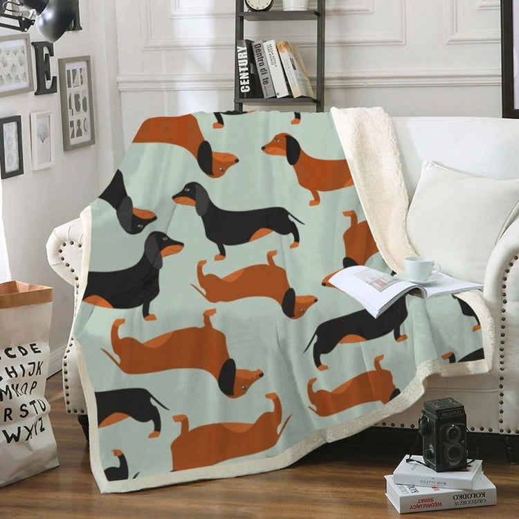 Made from super-soft Sherpa Fleece fabric, these adorable Sausage-Dog blankets come in seven charming Dachshund designs. Available in two sizes, the Small size is perfect for kids, while the Large size is ideal for adults to enjoy cozy moments with their favorite furry friends.