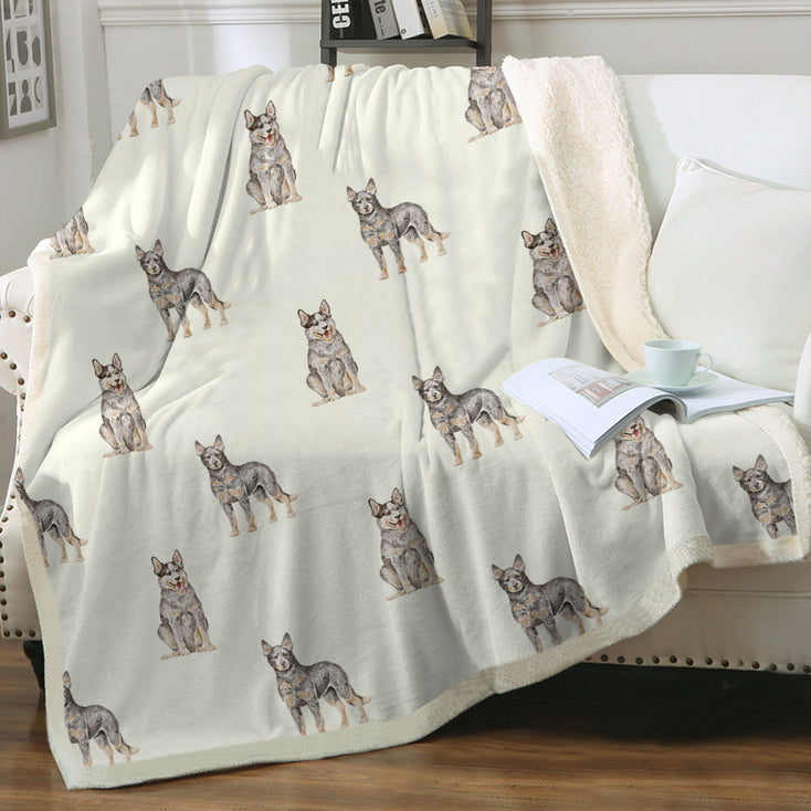 The blanket features a stunning watercolor pattern of Blue Heelers in their characteristic blue speckle coat. The soft brushstrokes and delicate shading bring out the breed's distinct features, capturing their spirited and loyal nature in exquisite detail.
