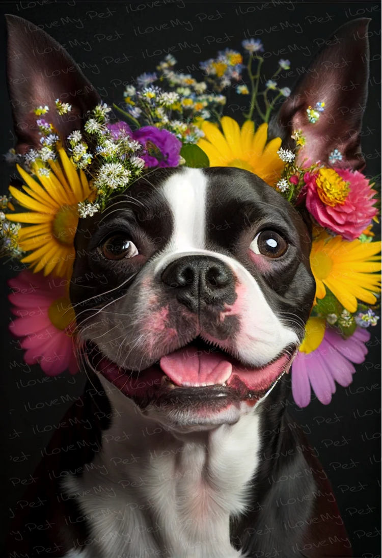 Celebrate the charm and joy of the Boston Terrier with our 'Blooming Bliss Boston Terrier Wall Art Poster.'