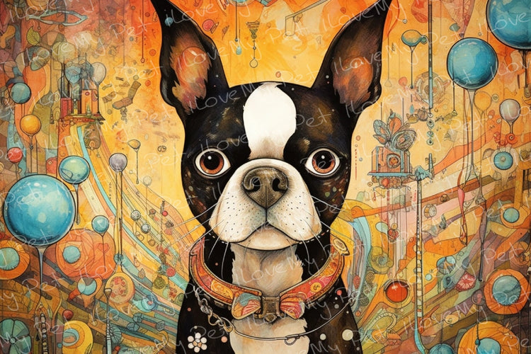 This captivating artwork is more than just a piece of decor; it's a rich narrative that intertwines the Boston Terrier's sharp wit and gentle manners with whimsical elements of time and space.