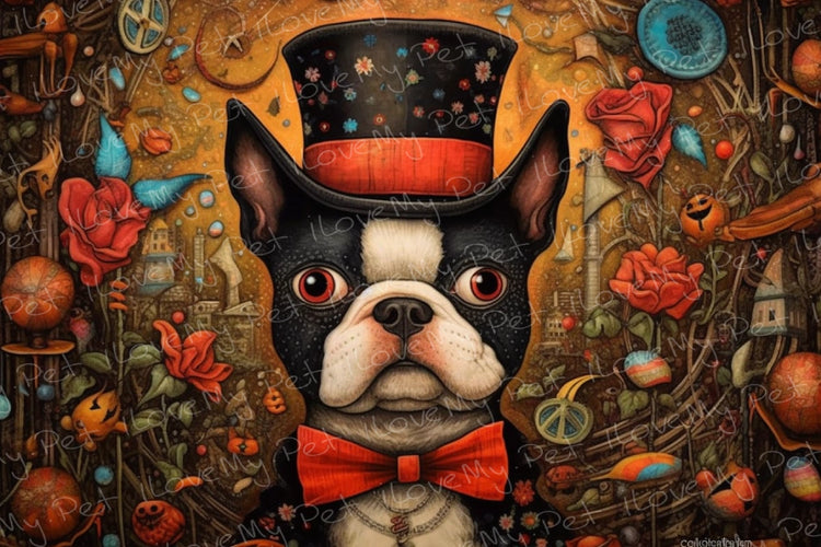 This exquisite artwork is more than a mere depiction; it's an invitation into a whimsical universe where the Boston Terrier, with its distinguished tuxedo-like coat and intelligent gaze, takes center stage.