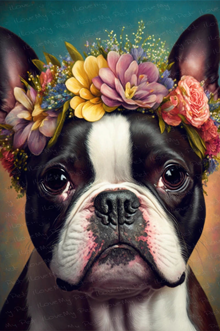 The art style gracefully combines lifelike detail with fanciful elements, showcasing the sleek coat and soft ears of the Boston Terrier in sharp detail, while adorning its head with a playful crown of vibrant flowers.