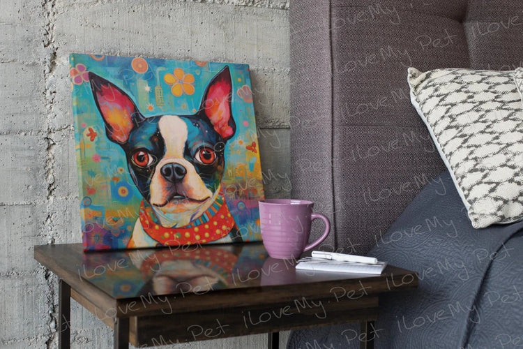 The cheerful red bandana on the Boston Terrier and the abstract, floral background make this Boston Terrier Decor piece a delightful focal point that is sure to capture the hearts of Boston Terrier lovers and art enthusiasts alike.